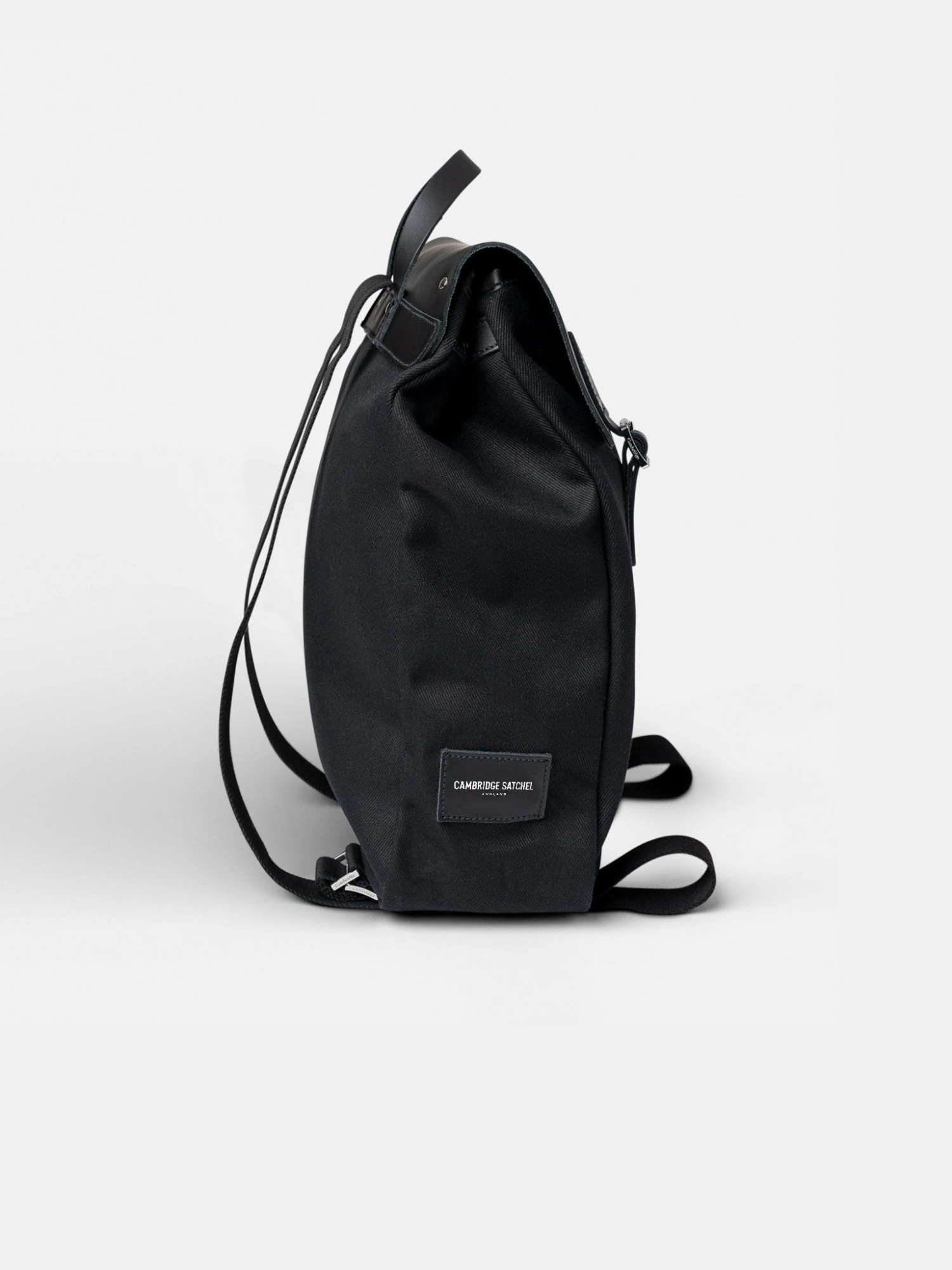 Originally part of a limited edition capsule collection but now a permanent fixture in The Cambridge Satchel Co. offering, this stylish backpack brings our renowned expertise in craftsmanship to a truly contemporary style. The body of The Steamer Backpack is made from tough and durable British cotton canvas which gives the bag water resistant properties and durability, while remaining comfortable to wear. This backpack is made from heavyweight black cotton canvas with our signature leather in a matching shade on its sleek top flap.